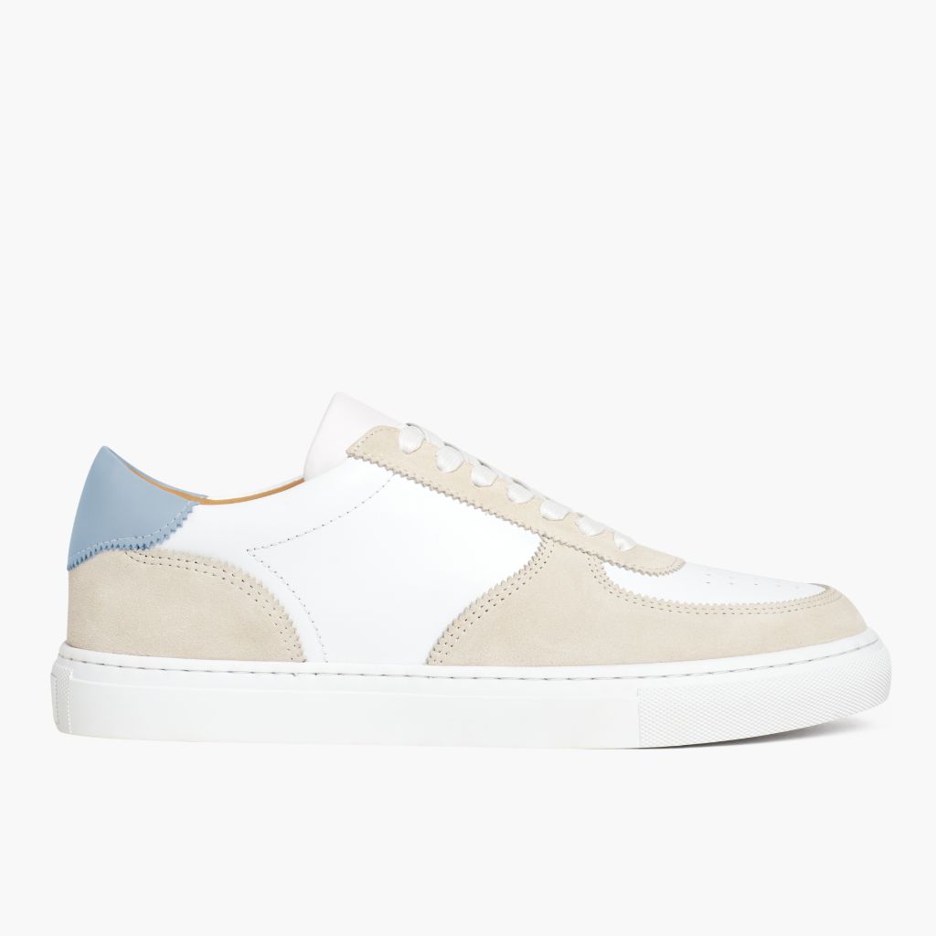- Beige Suede and Blue Leather Accents